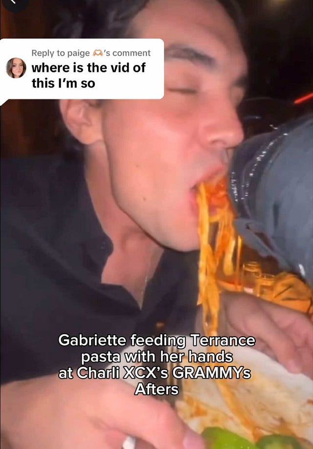 My favorite is an American influencer named Shanny who spends her time between Italy and the suburbs of Philadelphia. She has a large mouth, often making faces that accentuate it, and a catchphrase: “namo!”, taken from the Italian phrase for “let’s go!” The first time my algorithm fed me her videos, I opened the comment section and was greeted by hundreds of men, both young and old, posting variations of “Welcome, gentlemen!” If I had to guess, these men are not watching videos of bikini-clad Shanny cooking pasta for the burrata ooze at the end. She does not seem to mind it, either: these comments boost her posts, increasing her viewership and the possibility for her to get paid. Information about restaurants and recipes and ingredients has proliferated the internet such that there is no longer clout reserved merely for knowing: everybody knows. In a fragmented, vulgar digital economy driven by clicks and horniness, everything is on offer for everything in return. Do you know who else rose to online prominence as a hot girl who cooks? Matty Healy’s fiance.